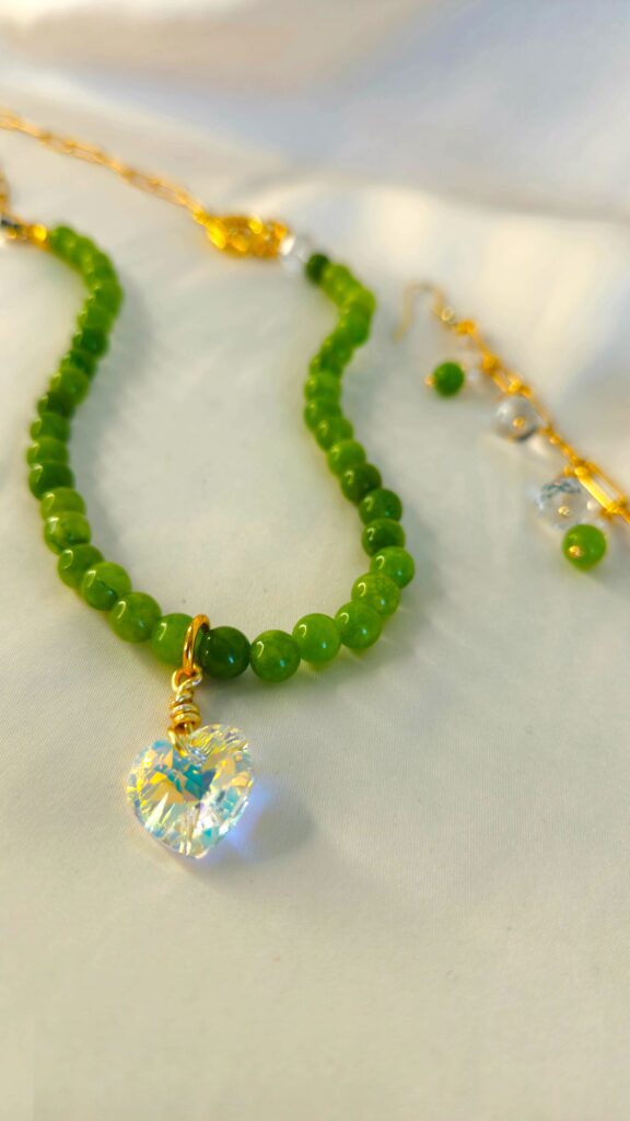 “A stunning necklace featuring olive green peridot, clear crystal, and a Swarovski heart, elegantly set on a durable stainless steel chain. Peridot’s energy inspires release, growth, and transformation.”