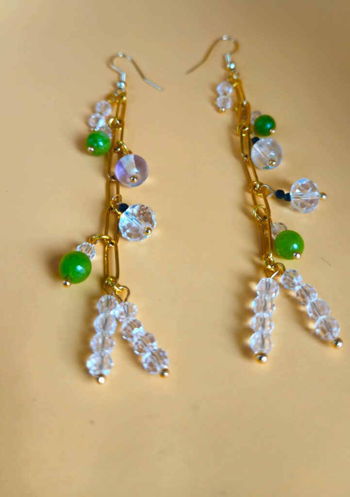 One of a kind olive green Peridot earring, adorned with clear crystals.
