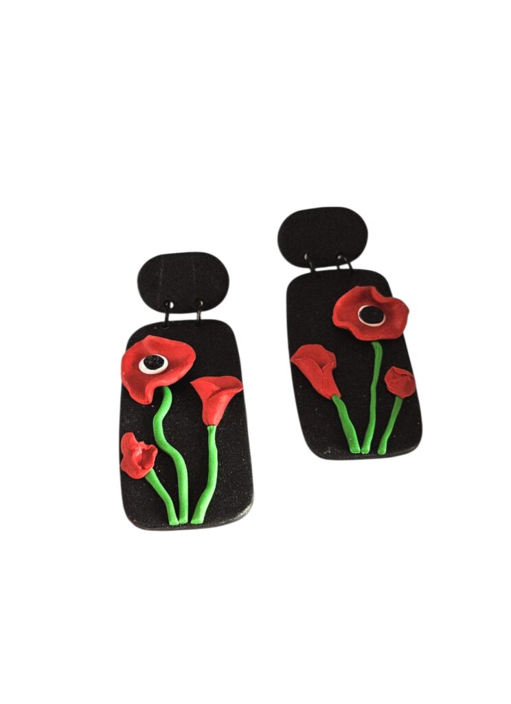 Elegant black drop earrings adorned with vibrant red poppy flowers, crafted for a bold yet graceful look. Ultra-lightweight for all-day comfort.